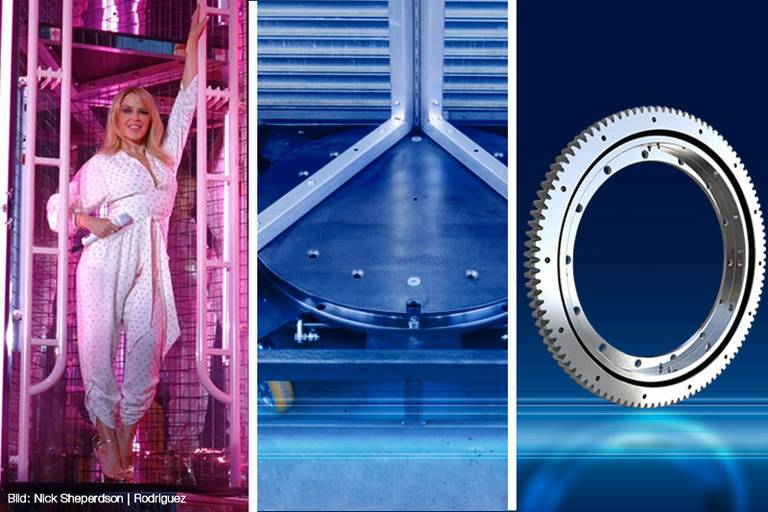 Die Kugeldrehverbindungen für das Showprogramm von Kylie Minogue bestehen aus hochwertigem Vergütungsstahl sowie Edelstahl und wurden wartungsoptimiert gefettet und abgedichtet gefertigt.